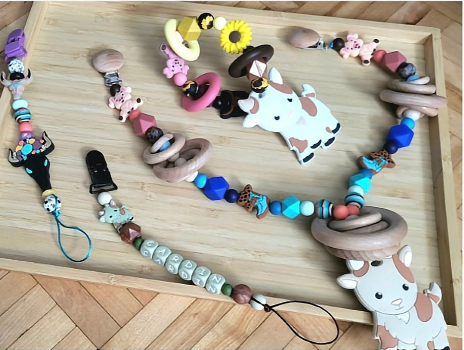 Ensemble de 2 attaches-suces (dont un avec prénom ou nom), 1 jouet de dentition/éveil pour poussette et 1 jouet de dentition anneau montés de façon sécuritaire avec + de 30 à 50 noeux de sécurité par article pour protéger bébé
