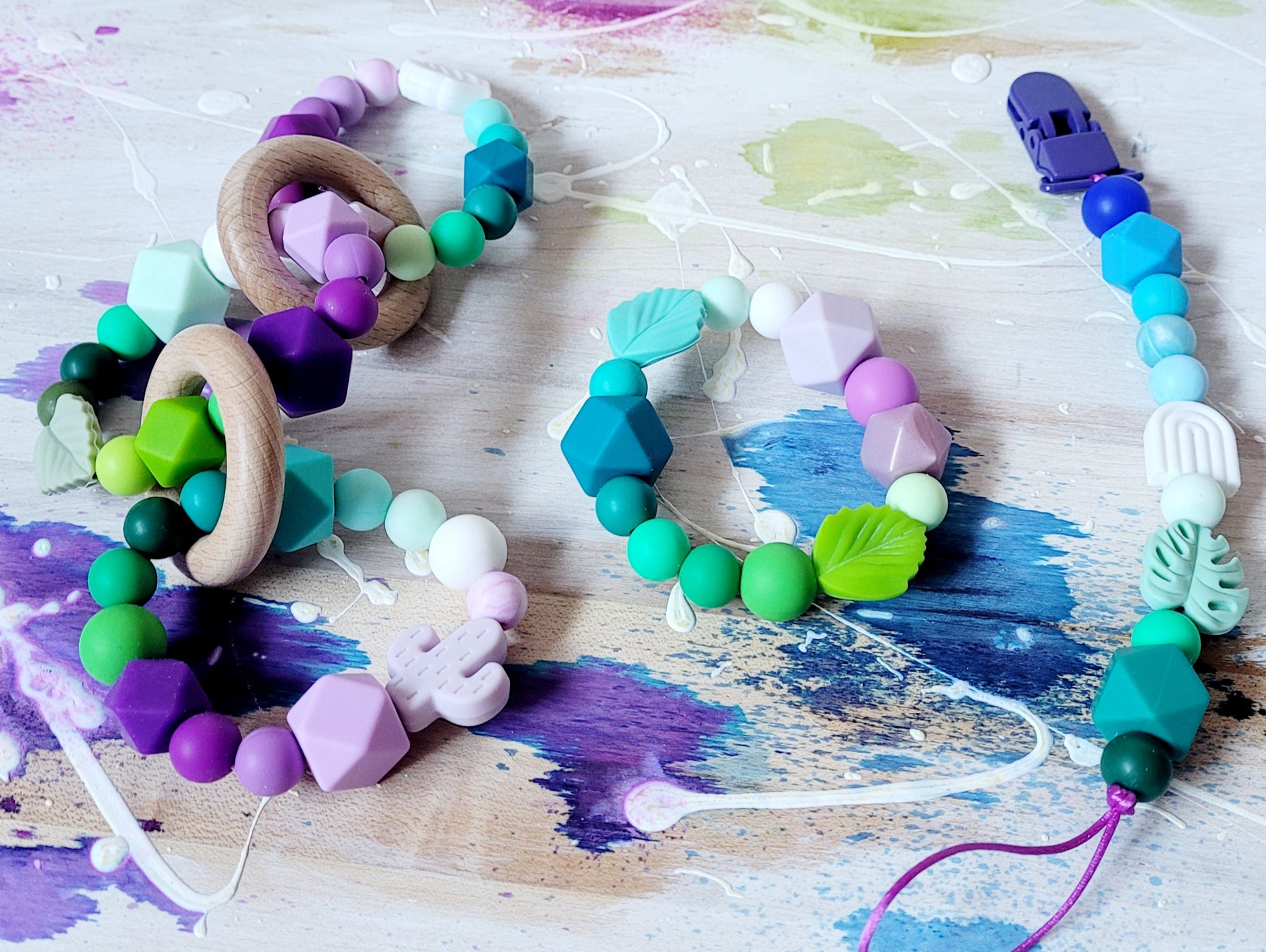 Ensemble d'un attache-suces, 1 jouet de dentition à 3 anneaux ef 1 jouet de dentition anneau montés de façon sécuritaire avec + de 30 noeux de sécurité par article pour protéger bébé